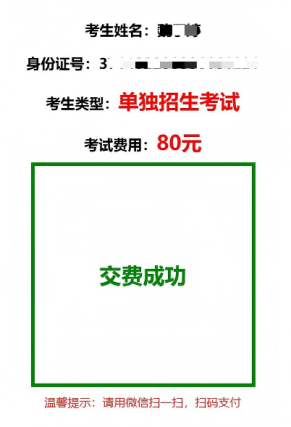 4.核实缴费金额(单招考生80元;综评和退役军人考生50元),确认无误后用微信“扫一扫”扫描显示的二维码进行缴费。