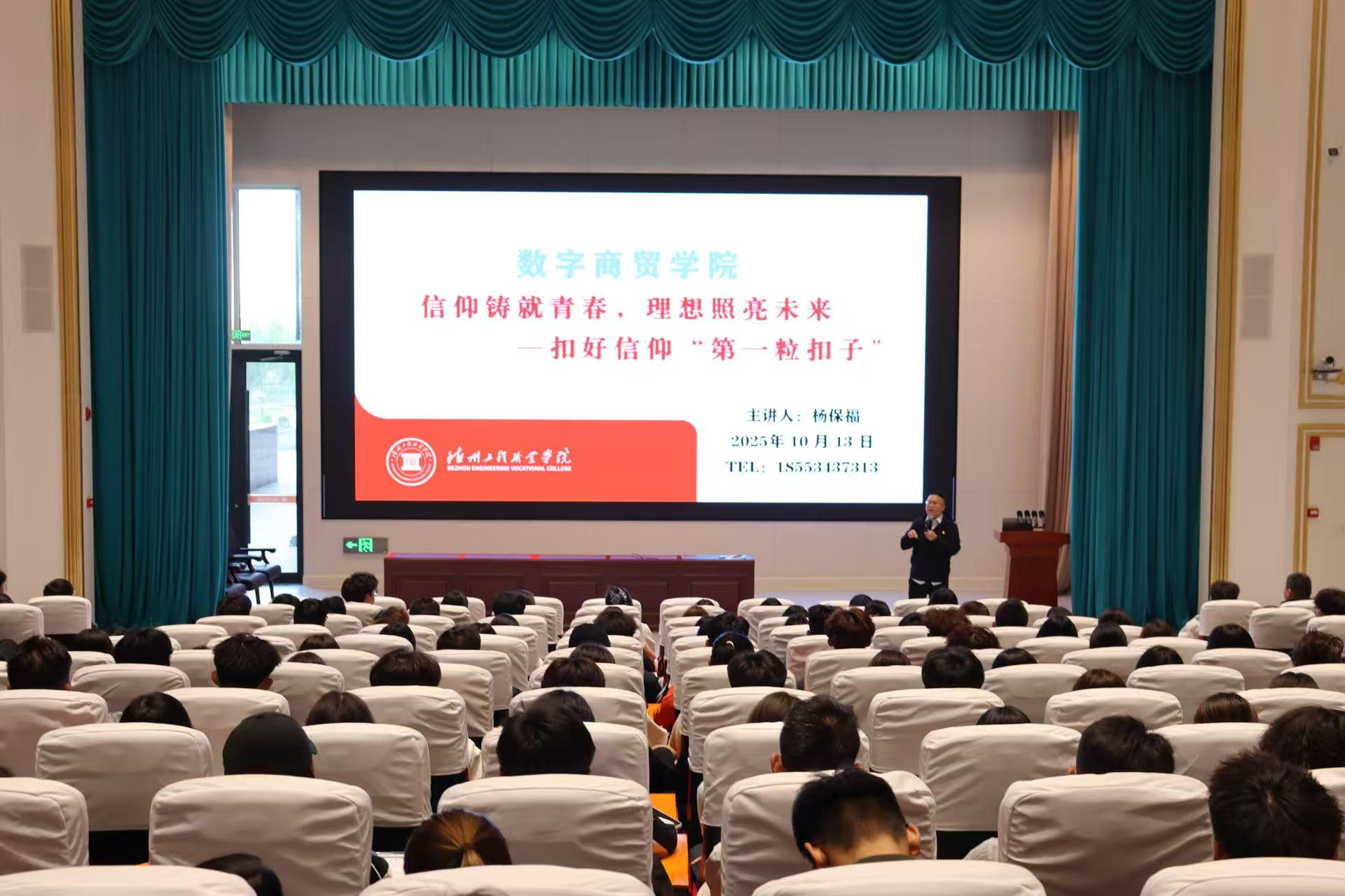2025年10月13日16:00-17:30,在复兴大厦一楼德水报告厅,数字商贸学院开展以“信仰铸就青春,理想照亮未来”为主题的专题培训讲座。本次讲座由数字商贸学院党总支书记、院长杨保福主讲,25级学生会成员代表及25级各班委代表参与讲座。