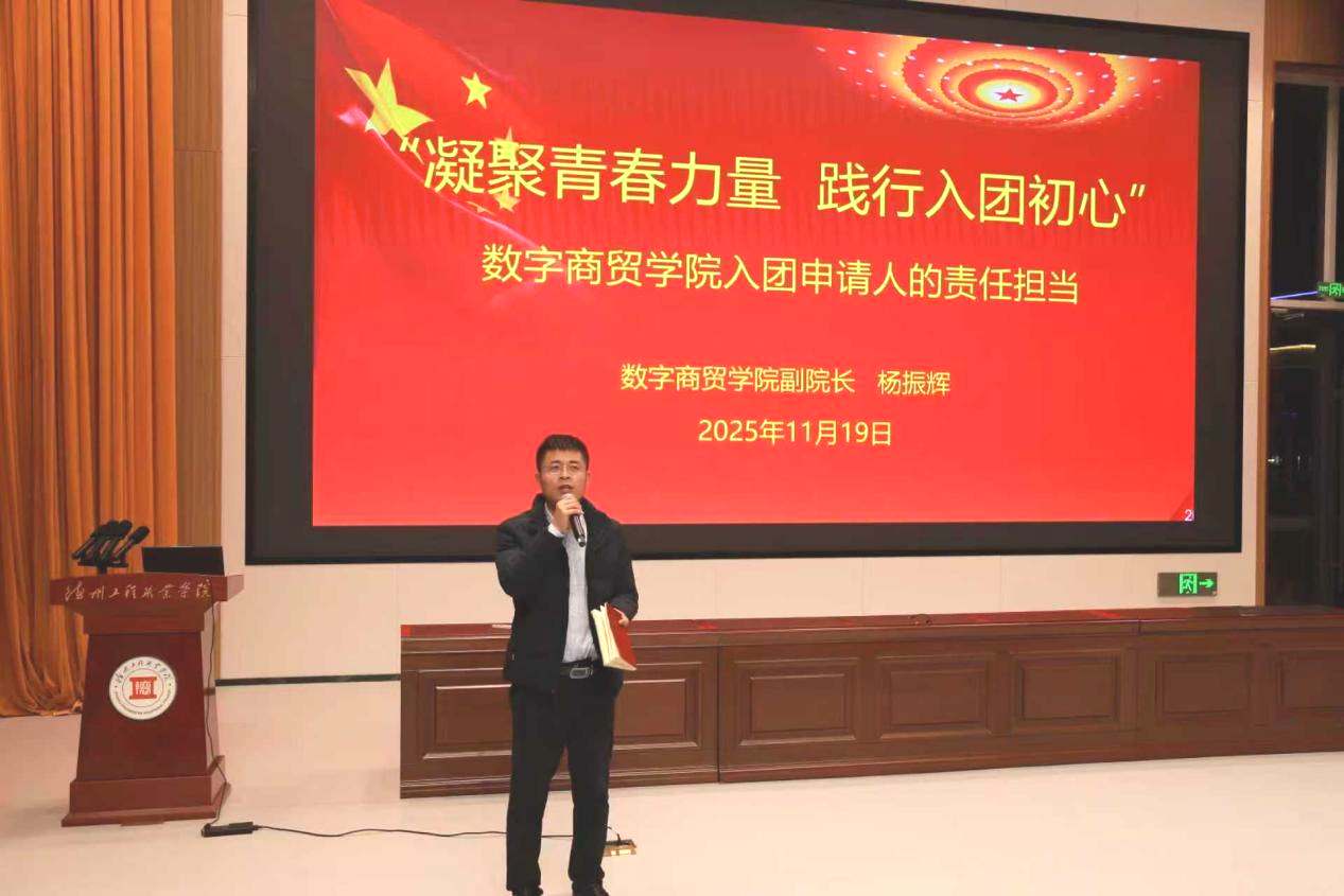 为深入贯彻落实新时代共青团改革要求,加强对入团申请人的培养.教育和考察,增强共青团员的先进性和光荣感,2025年11月19日19:00,数字商贸学院团总支在复兴大厦一楼东报告厅开展以“凝聚青春力量,践行入团初心”为主题的入团申请人集中谈话会议。学院党总支书记、院长杨保福,副院长杨振辉及24级、25级入团申请人参会,本次会议由孙延鹏老师主持。