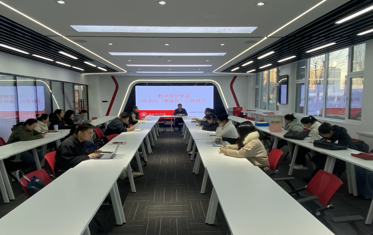 2025年11月25日17:00,数字商贸学院在京东一楼北侧会议室召开班主任(辅导员)工作例会。数字商贸学院副院长杨振辉,以及全体班主任(辅导员)参加会议。