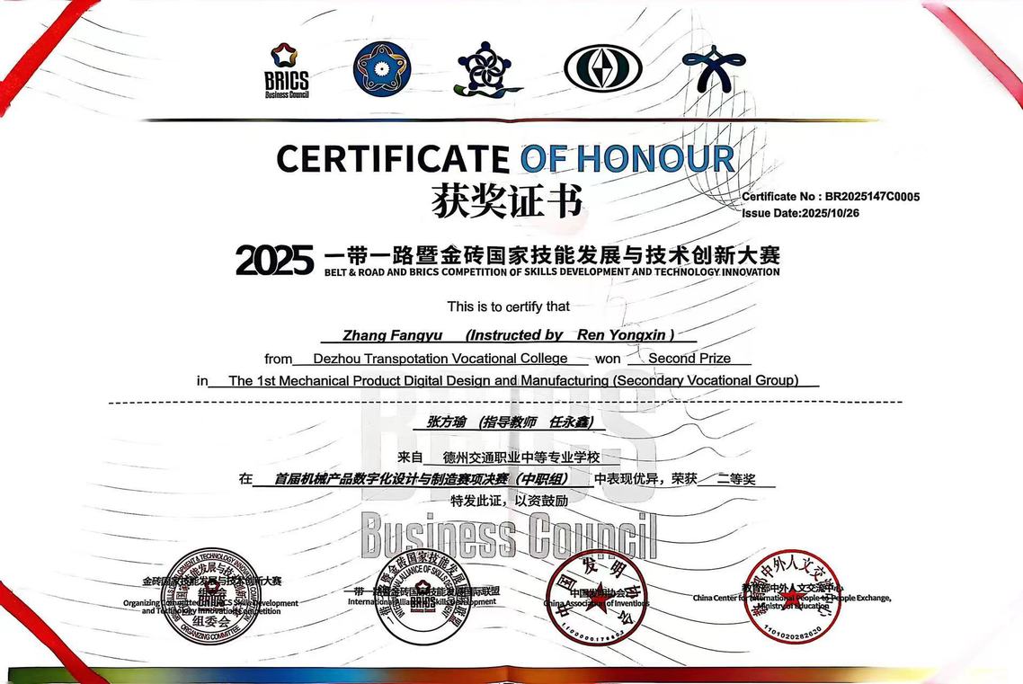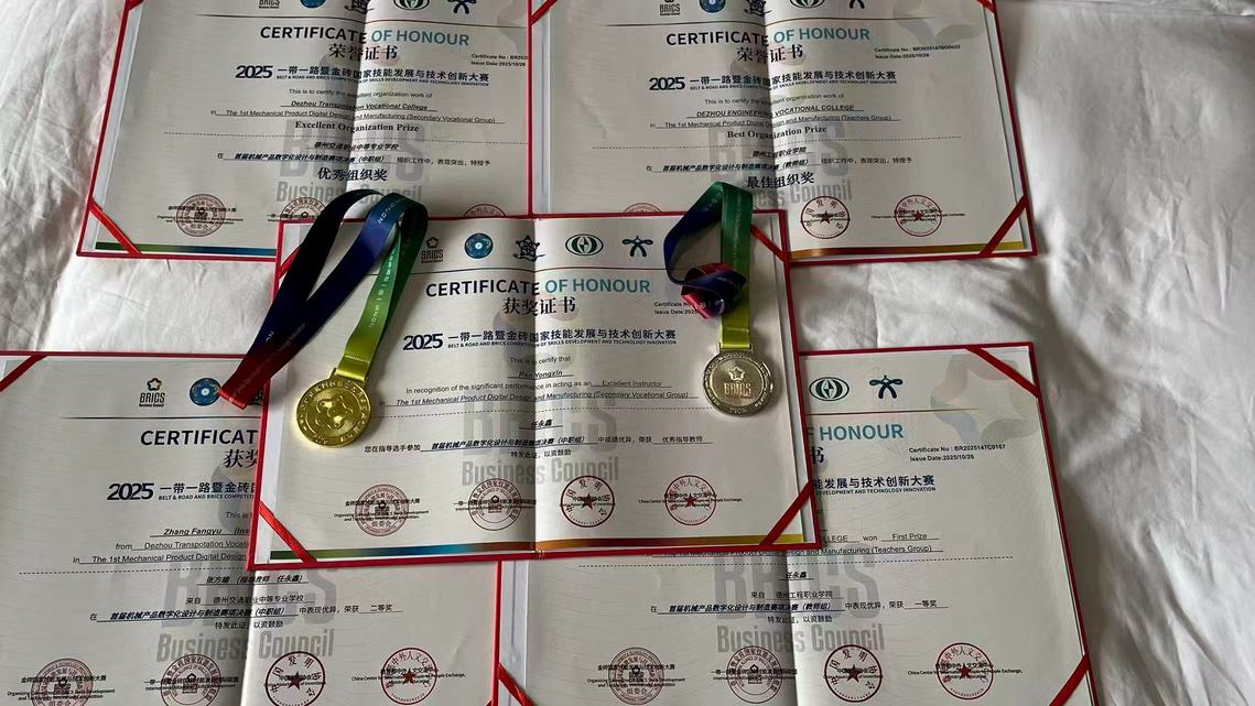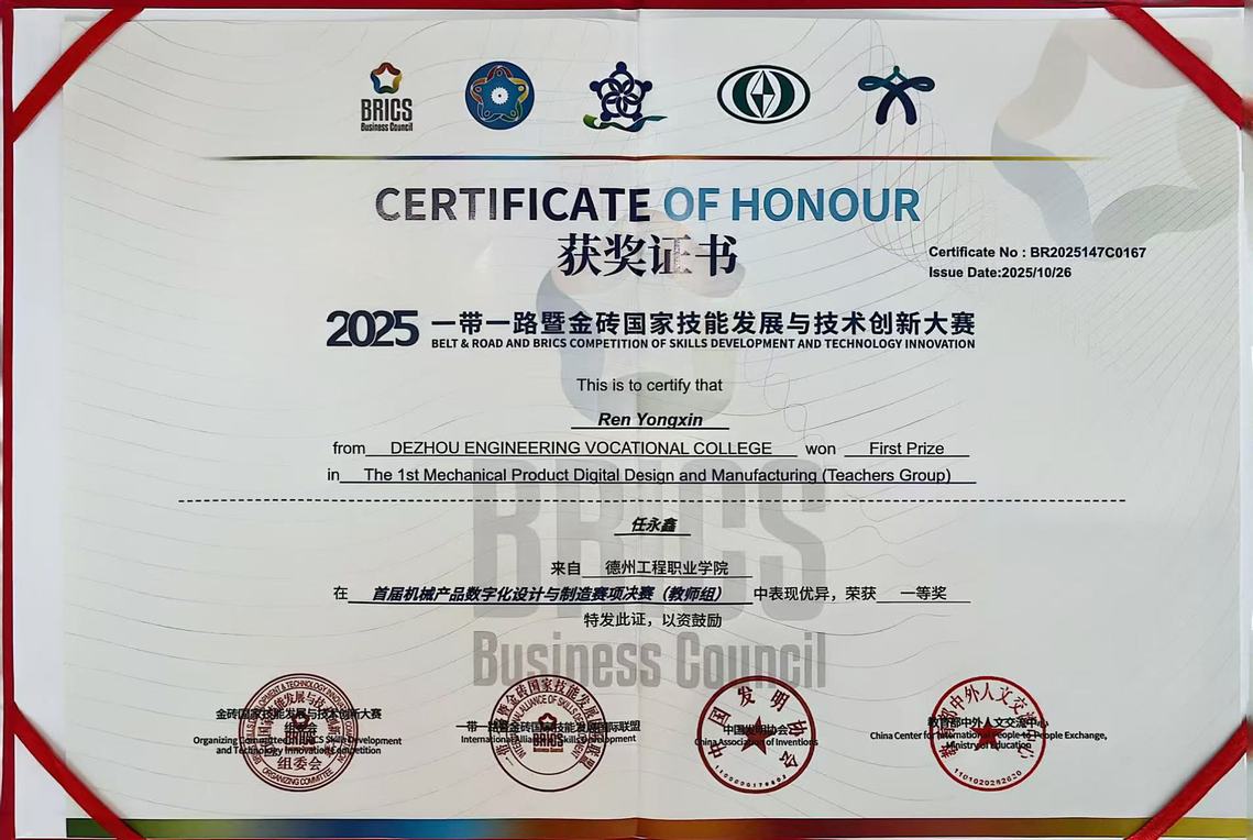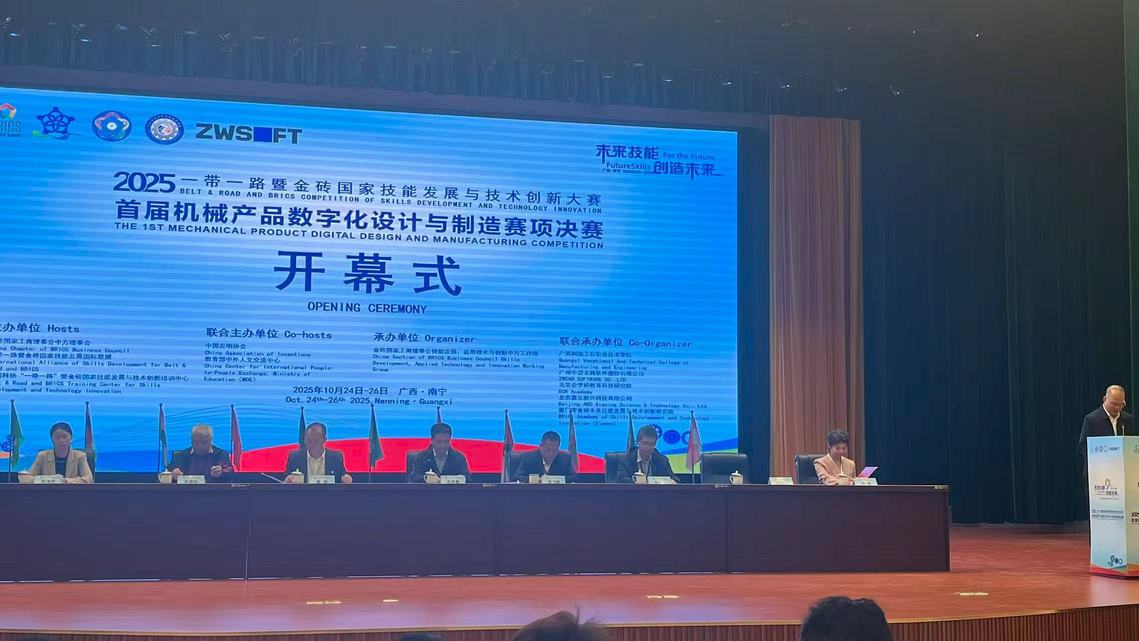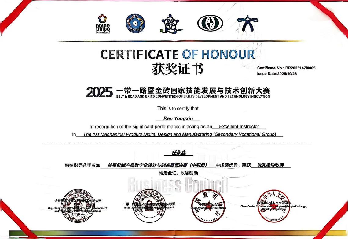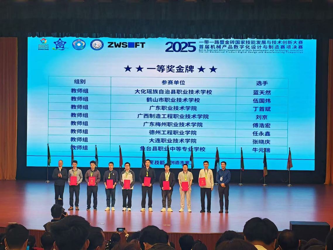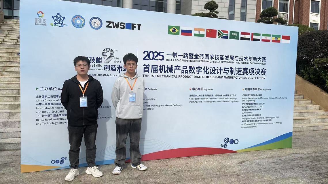 10月27日,2025“一带一路暨金砖国家技能发展与技术创新大赛”之首届机械产品数字化设计与制造赛项决赛在广西南宁圆满落幕。在这场代表职业技能领域顶尖水平的国家级A类国际赛事中,我院师生与来自国内外的优秀选手同台竞技,表现卓越,最终载誉而归。任永鑫老师凭借精湛技艺与深厚专业积淀,勇夺教师组一等奖(金奖),在其悉心指导下,张方瑜同学亦不负众望,荣获中职组二等奖(银奖)。这一成绩充分彰显了我院在先进制造领域高水准师资建设与高质量人才培养方面的综合实力。