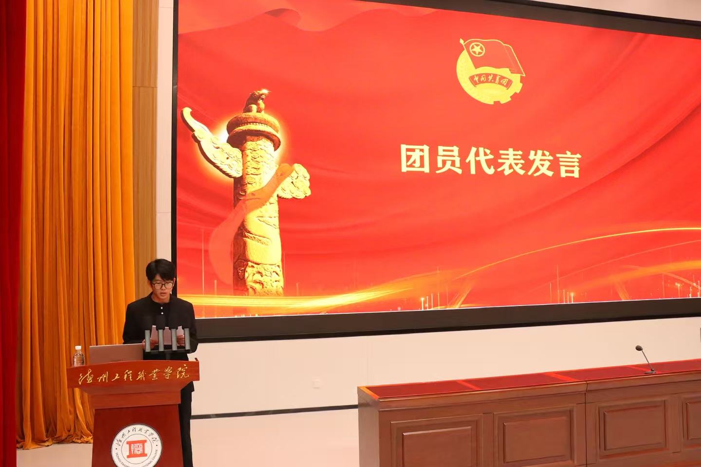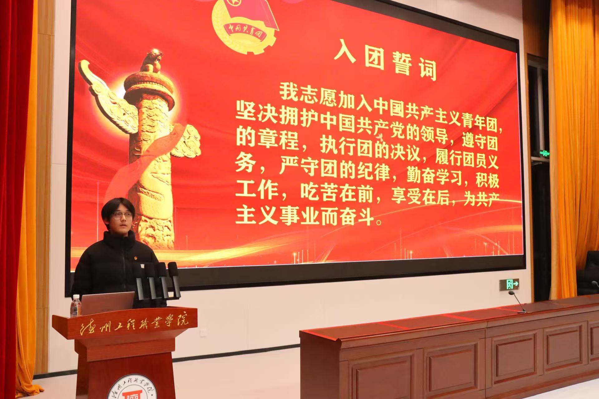 仪式现场,省奖学金获得者、优秀团员代表张元哲作为领誓人,带领全体新团员举起右拳,面向团旗庄严宣誓。“我志愿加入中国共产主义青年团……”铿锵有力的誓言回荡在报告厅内,字字千钧,既是新团员对团组织的郑重承诺,也是他们矢志奋斗的青春宣言。宣誓完毕,张元哲同学分享了自己的专业学习经历与团员成长感悟,以榜样之力为新团员指引方向;新团员代表也登台发言,表达了加入共青团的激动心情与未来践行誓言、勇担使命的坚定决心。