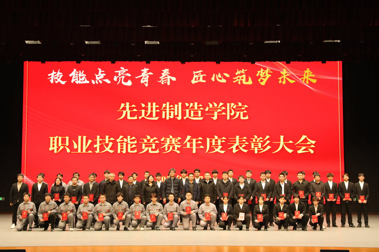 大会最后,全体领导、嘉宾与受表彰师生移步台前合影留念,定格这一荣耀瞬间。表彰有期,奋斗不止。此次表彰大会不仅是对过往成绩的总结与肯定,更是对未来征程的动员与期许。先进制造学院将以此次大会为契机,深化产教融合、校企合作,持续营造崇尚技能、学习技能、投身技能的浓厚氛围,让工匠精神在校园落地生根,助力更多青年学子以技能为翼,在制造强国建设的征程中书写青春华章!