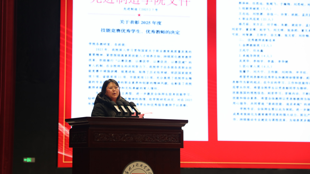 过去一年,先进制造学院学子在各级各类职业技能竞赛中捷报频传,斩获国家级奖项5项、省级奖项11项、市级奖项13项,用实力展现了精湛的专业技能与昂扬的精神风貌。教学副院长展瑞姣宣读《先进制造学院关于表彰2025年度技能竞赛优秀学生、优秀教师的决定》,正式揭晓表彰名单。