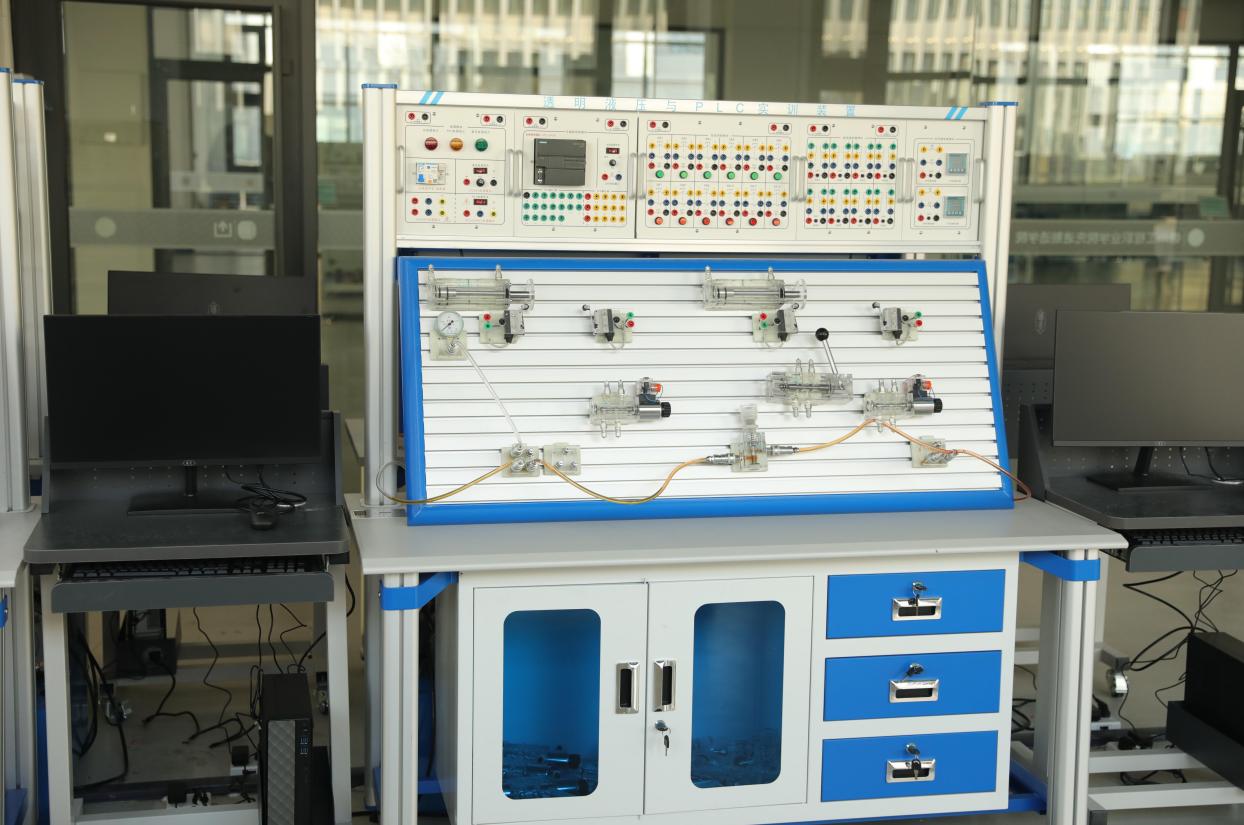 实训室配备透明液压与PLC实训装置等专业设备(如图所示),该装置集成液压元件、PLC控制系统、电气控制模块于一体,具备元件认知、回路搭建、程序控制、故障模拟等多功能实训能力。