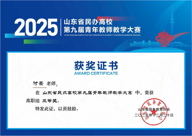 近日,在山东省民办高校第九届青年教师教学大赛中,信息工程学院付豪老师凭借扎实的专业功底、精湛的教学技艺与出色的现场表现,在比赛中脱颖而出,荣获三等奖。