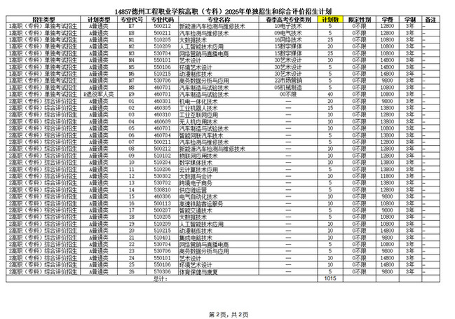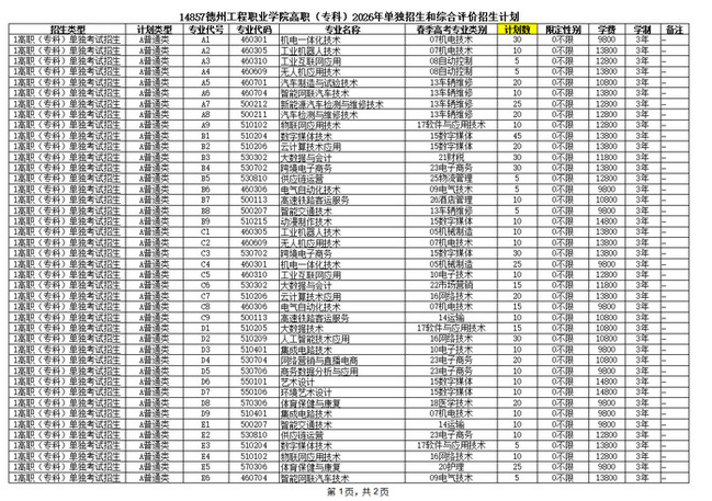 德州工程职业学院高职(专科)2026年单独招生和综合评价招生计划