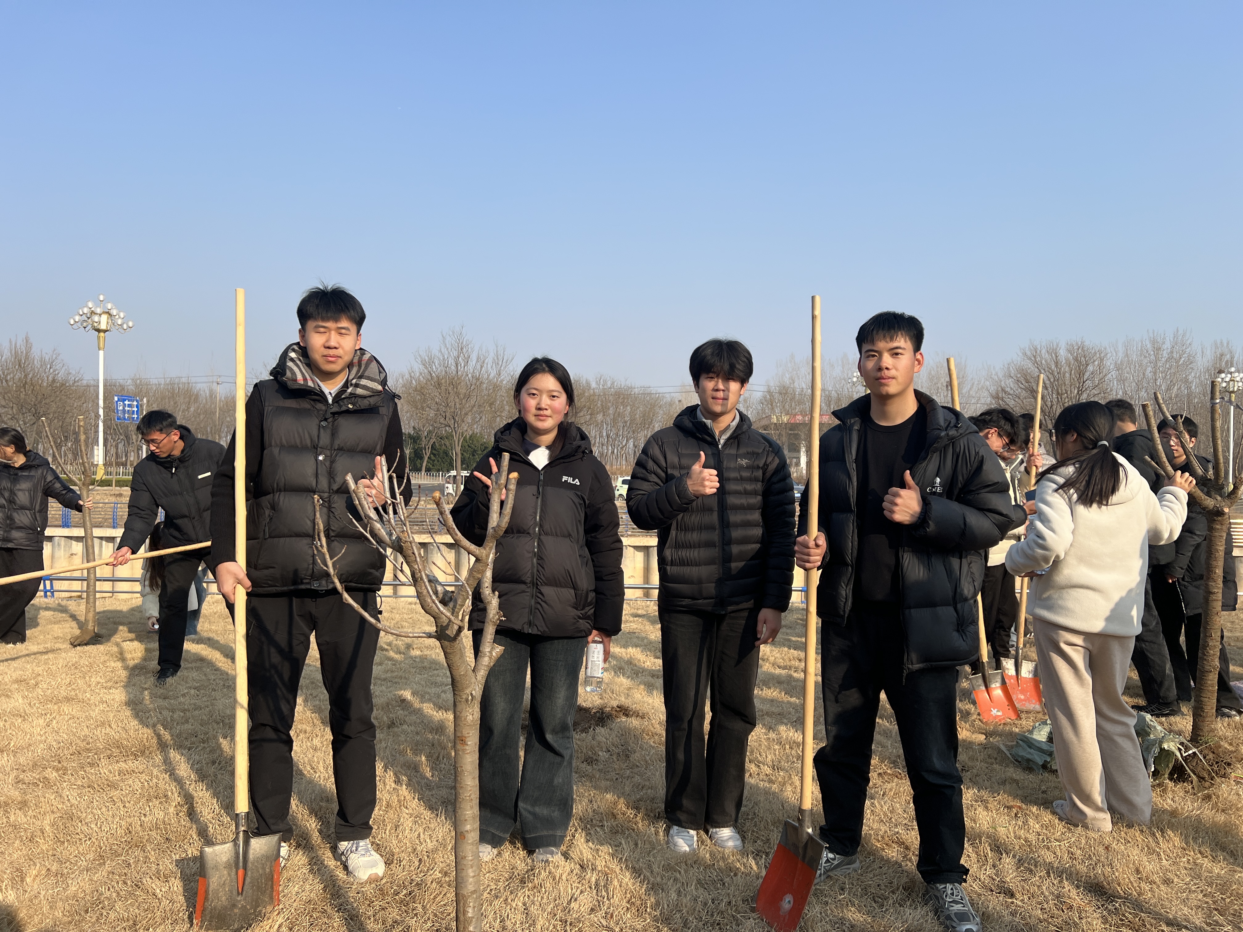 活动由学院团总支精心组织,申志威老师现场指导,师生代表分工协作、有序参与。活动现场,老师示范规范植树流程,讲解樱花树苗养护要点;同学们默契配合、挥锹培土、扶苗浇水,以实际行动美化校园。本次种植的苗木为适配北方气候的优质观赏樱花,连片成带并预留观赏步道,将成为校园特色生态景观。植树结束后,大家悬挂树牌、清理现场,以文明实践守护绿色成果。