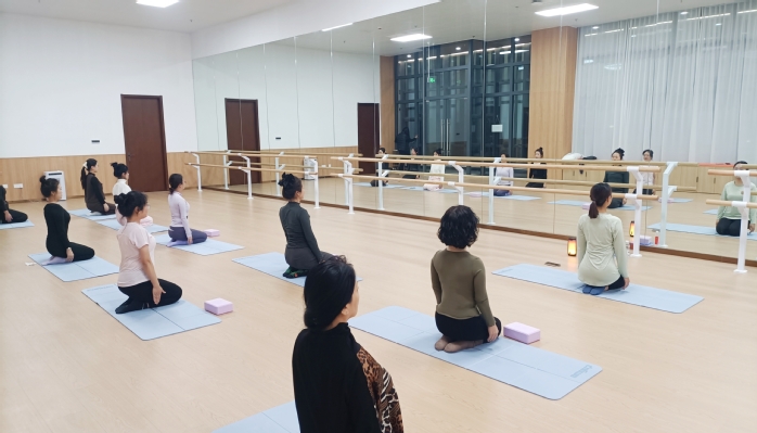傍晚时分,排练厅内灯光柔和,空气中弥漫着宁静的气息。在孙老师的温柔引导下,大家首先从调整呼吸开始,逐步放松身心。随着舒缓音乐的流淌,大家跟随孙老师的细致讲解与示范,依次学习婴儿式、金刚坐、猫式呼吸等基础动作。动作舒展间,专注与宁静在室内悄然蔓延。