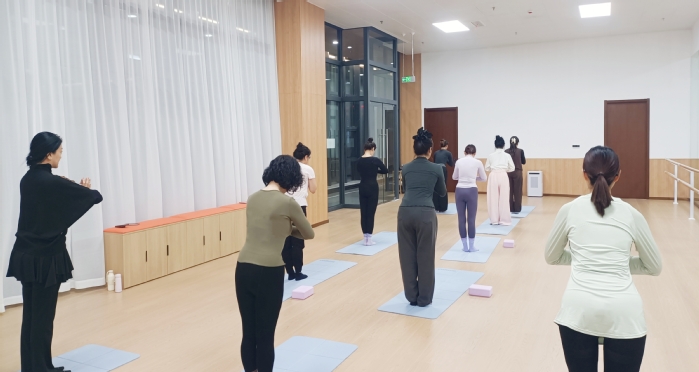 为丰富教职工课余文化生活,关注身心健康、缓解工作压力,在校工会的积极提议与统筹协调下,我校首节“教职工瑜伽课堂”于12月17日晚在新青年剧场二楼排练厅顺利开展,吸引了十余名女教职工热情参与。本次课程由校工会精心安排,特邀学工处孙英敏老师担任授课老师。