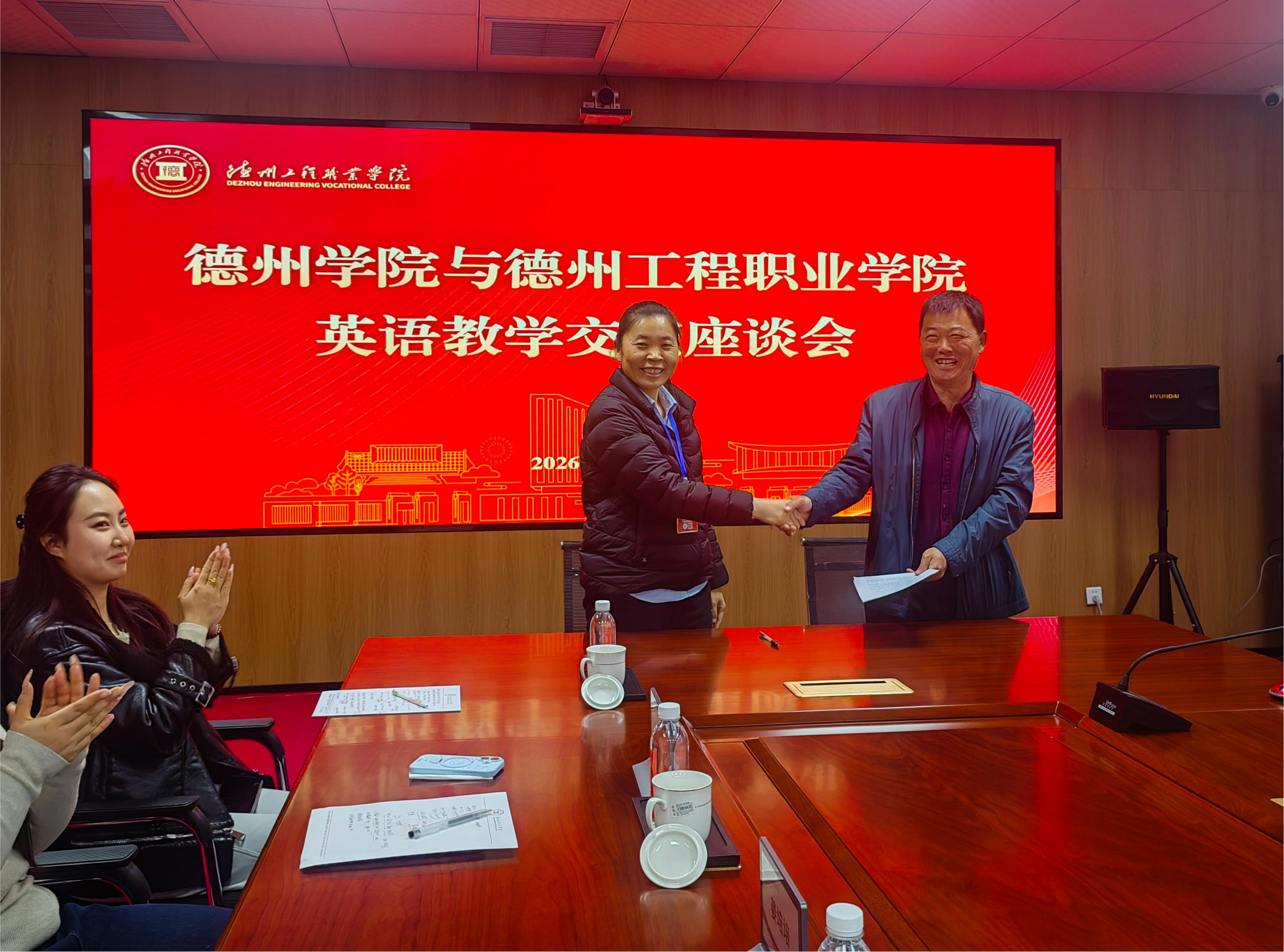 为深入推动高等教育与职业教育协同发展,实现资源共享、优势互补,近日,德州工程职业学院教务处、基础教学部与德州学院外国语学院联合开展了合作共建活动。德州学院外国语学院党委书记孙红旗携部分英语教师到访,德州工程职业学院党委书记王金利、副校长王守庆、党建联络员赵金凯,以及教务处、基础教学部负责人和英语教研室全体教师参加共建活动。