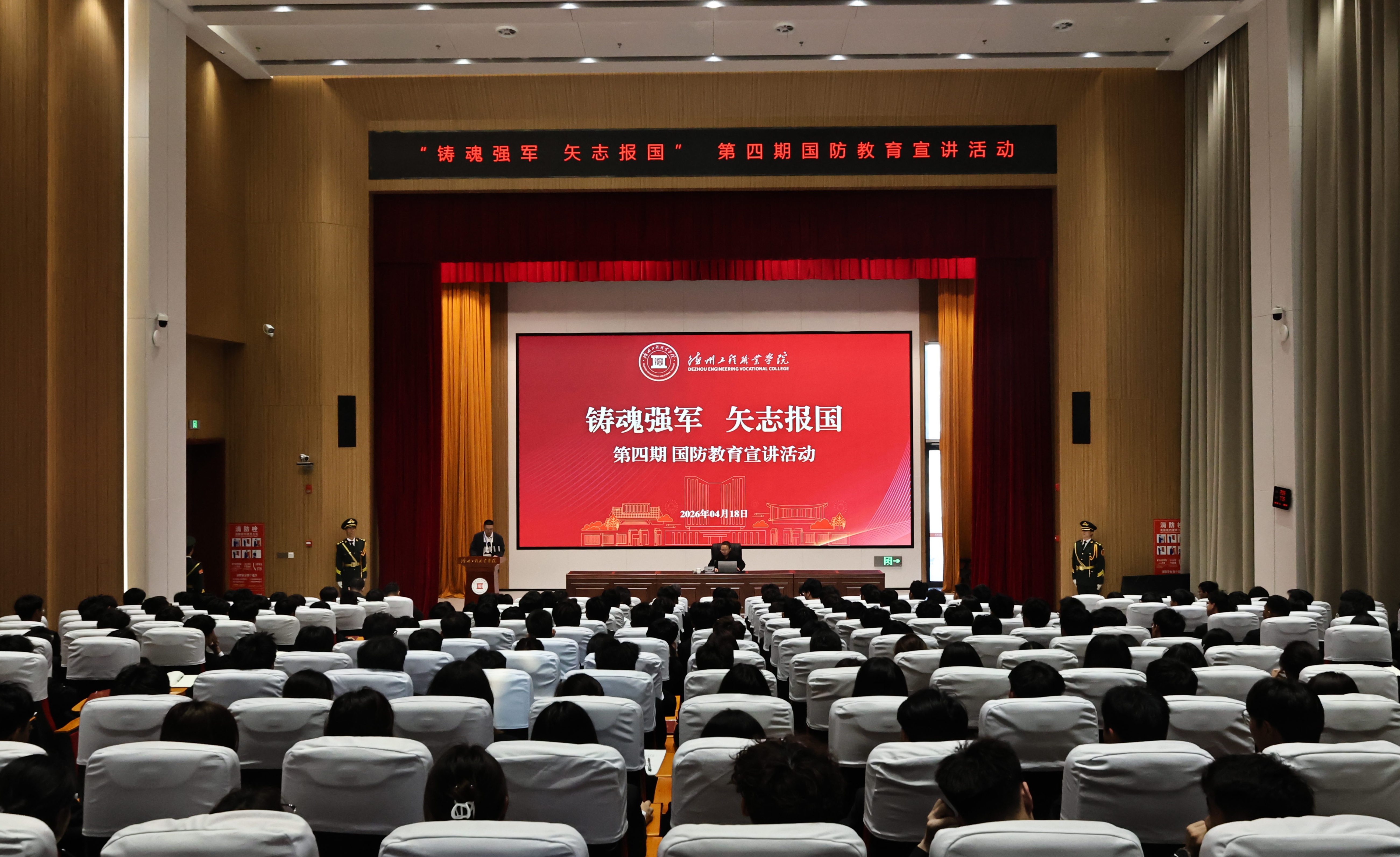 4月15日上午,德州工程职业学院在复兴大厦一楼泰山厅开展“铸魂强军,矢志报国”第四期国防教育专题宣讲。本次宣讲特邀军事科学院战争研究院原副院长、纪委书记石凤军,原国防大学出版社发行部主任闫立炜授课,学校党委委员、副校长刘建波,入党积极分子、入党申请人及学生会、团委成员等280名师生代表参加本次宣讲。