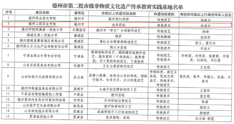 9 月 28 日,德州市文化和旅游局(广电局)(文物局)公布第二批德州市市级非物质文化遗产传承教育实践基地, 我校成功入选。这为学校的发展赋予了更深层的文化内涵与 社会责任,有利于促进学校与地方文化资源的深度整合,将 成为校园文化育人体系的关键一环。