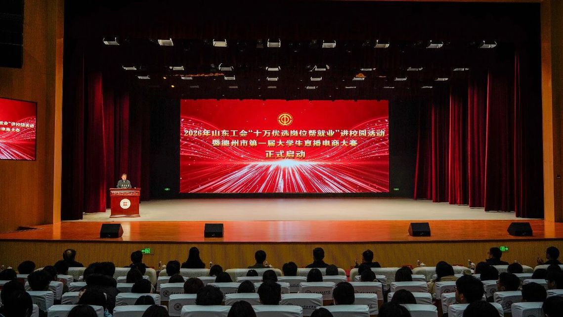 3月17日,2026年山东工会“十万优选岗位帮就业”进校园活动德州专场暨德州市第一届大学生直播电商大赛启动仪式在我校举行。省总工会党组成员、副主席卯金涛,德州市政协副主席、党组副书记、市总工会主席才玉璞等省、市领导出席活动,学校校长魏荣庆参加活动。德州学院、德州职业技术学院、山东华宇工学院、德州工程职业学院、德州科技职业学院5所高校学生及有应聘需求的社会求职者齐聚现场,130余家优质企业携岗参会,搭建起精准对接的就业桥梁。