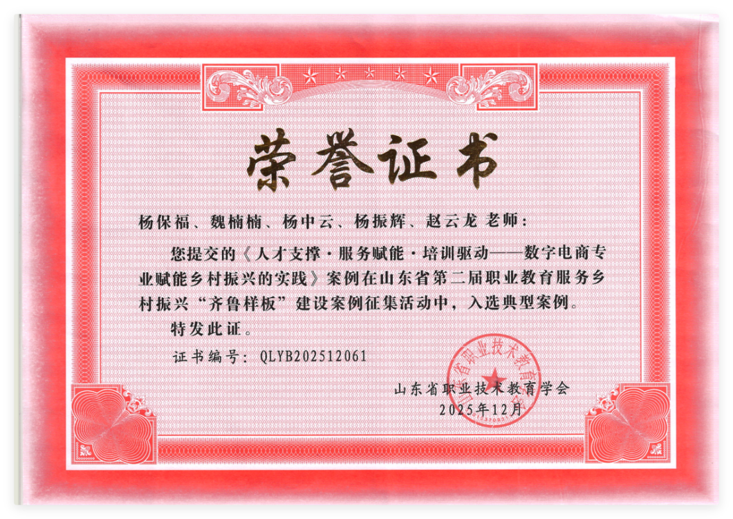 近日,山东省职业技术教育学会公布了第二届职业教育服务乡村振兴“齐鲁样板” 建设案例征集活动的评选结果。由我院杨保福、魏楠楠、杨中云、杨振辉、赵云龙老师团队完成的《人才支撑・服务赋能・培训驱动 —— 数字电商专业赋能乡村振兴的实践》案例成功入选典型案例,这是我院在职业教育服务乡村振兴领域取得的又一重要成果。