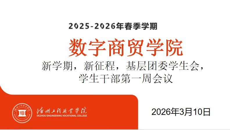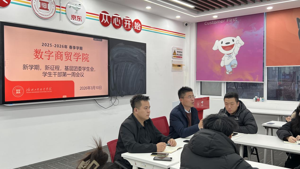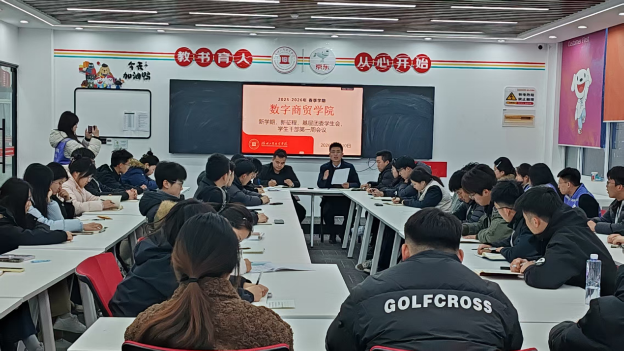 为明确新学期学生工作方向、强化学生干部队伍建设,数字商贸学院于2026年3月10日18时在京东一楼南会议室召开新学期基层团委学生会、学生干部第一周会议。副院长杨振辉、辅导员老师左奔、闫巨成,学生会主席团成员以及各部门部长、副部长参加会议,会议由左奔老师主持。
