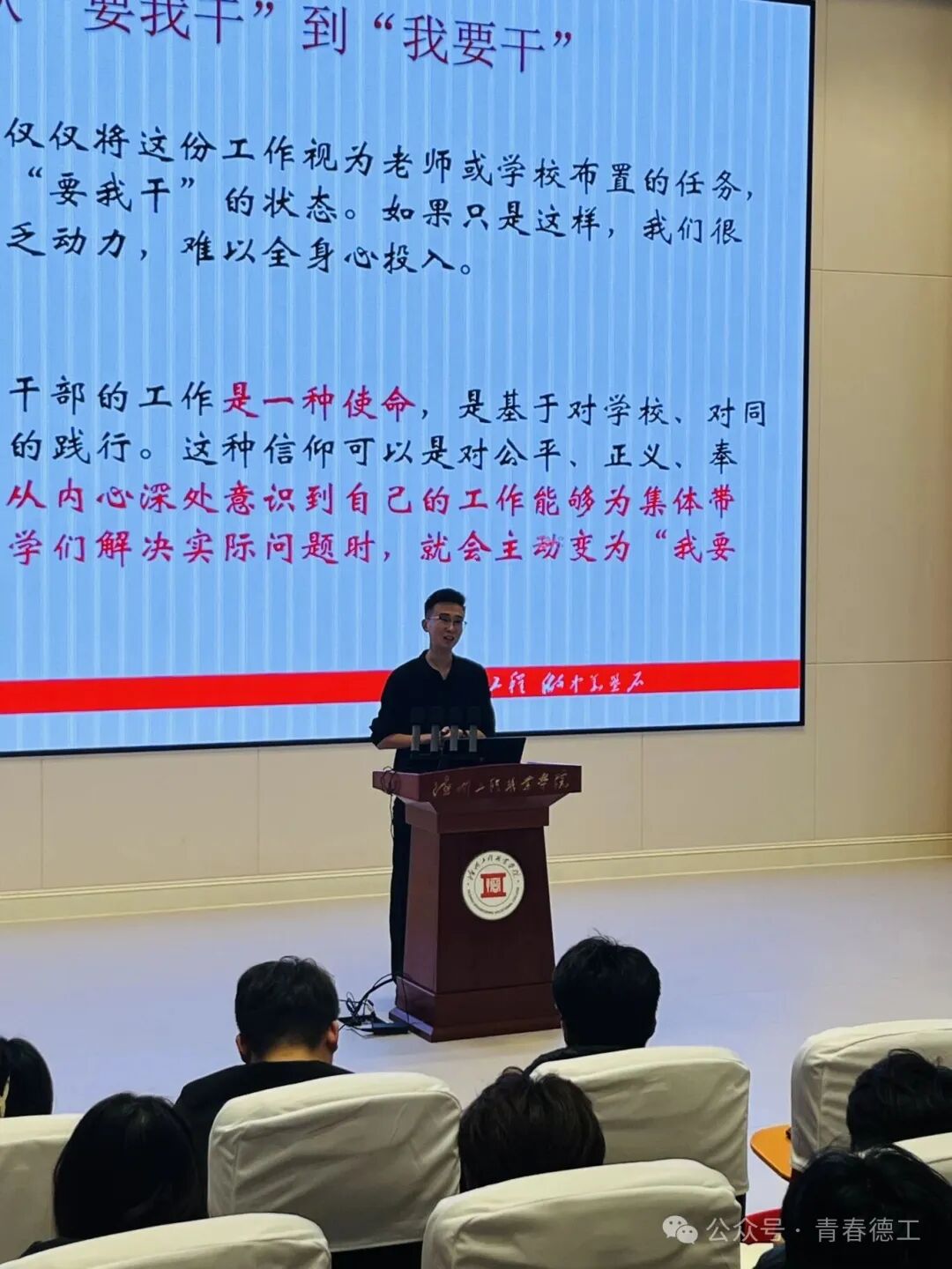 随后,他围绕《德州工程职业学院学生违纪处分条例》和《学生干部管理办法》,结合校园典型案例详细解读了纪律处分的种类、适用情形及学生干部行为规范,强调学生干部作为先进分子必须以身作则、严于律己,发挥模范带头作用,学生会工作要坚持公平、公正、公开原则,切实维护广大同学合法权益。