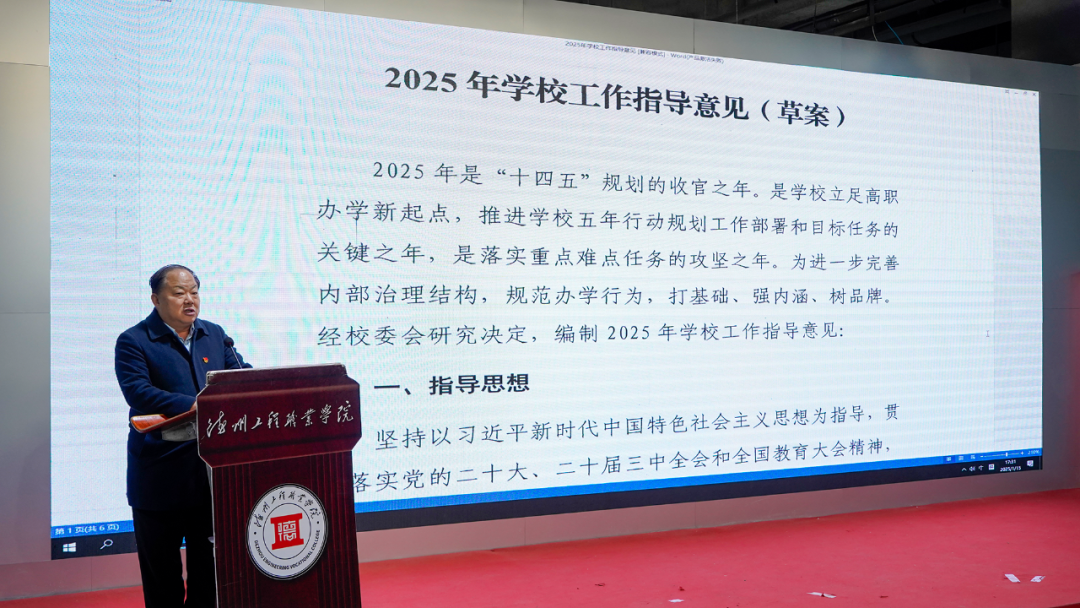 魏荣庆在会上宣讲了2025年学校工作指导意见,明确提出了20个任务要点,涵盖专业建设、师资队伍建设、校园文化建设、产教融合等多个关键领域,为学院新一年的工作指明了重点与方向。同时,他还提出了4个工作要求,强调在2025年,要提高政治站位、压实工作责任、加强督导考核、务求工作实效,确保各项工作任务能够高质量完成。