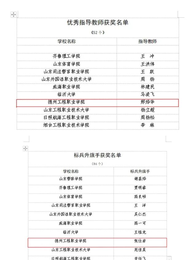 近日,山东省第四届大学生国旗护卫队展示活动获奖名单正式公示,德州工程职业学院国旗护卫队凭借过硬素质和良好精神风貌荣获升旗展演二等奖,学工处邢烨华老师获评 “优秀指导教师”,24级学生张仕岩、魏利鑫获评“标兵升旗手”,学校在全省142所高校的激烈竞争中闪耀青春风采。