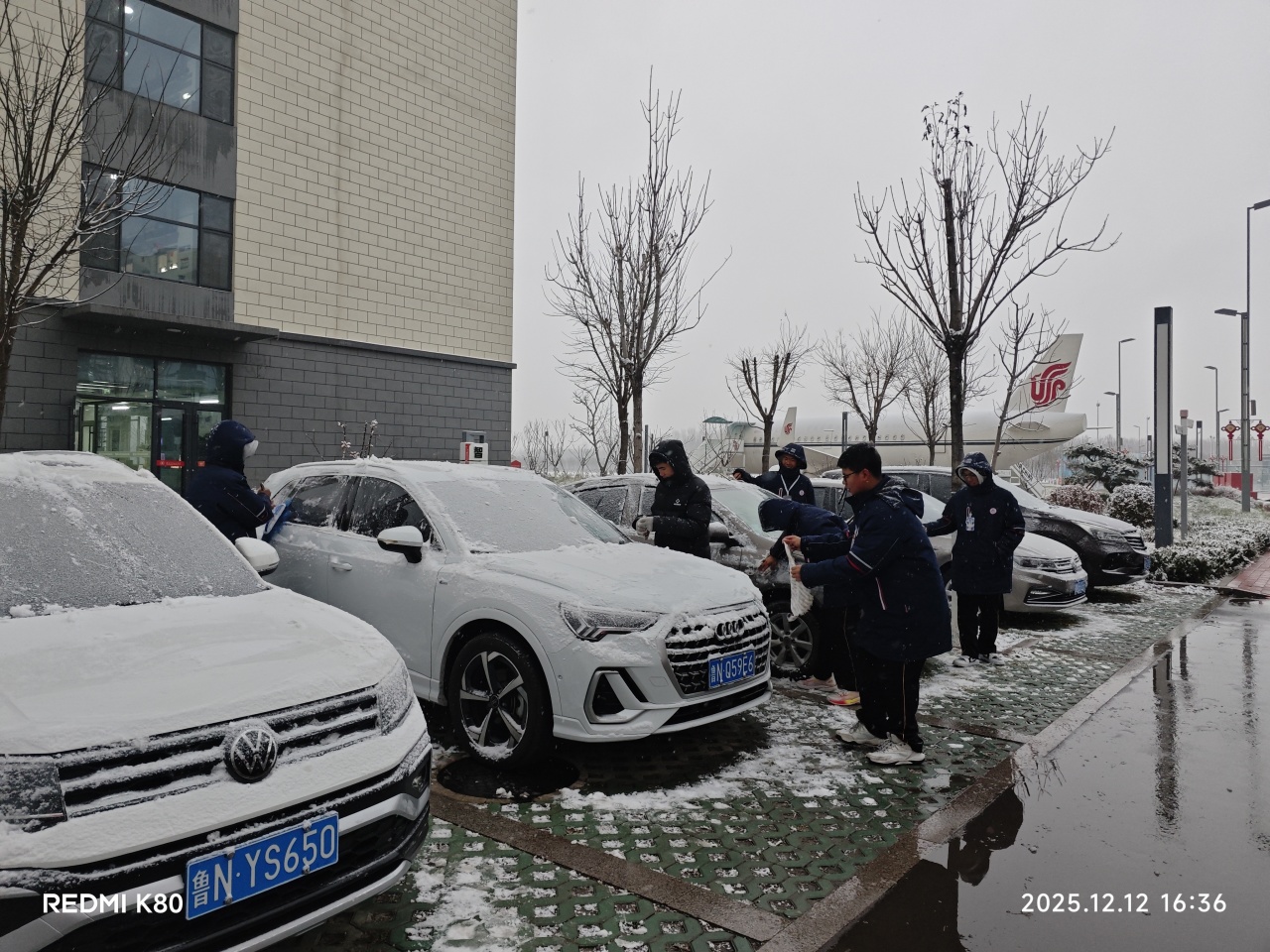 下课后,学院的同学们便自发行动起来,纷纷来到楼下停车场。大家手持扫帚、抹布,主动为老师们清除车辆上的积雪。寒风中,同学们分工协作、干劲十足,有的清扫车顶积雪,有的铲除车窗冰霜,不放过任何一个影响行车安全的细节。“老师平时教学辛苦,雪天路滑,我们多做点,老师通勤就能更安全放心。”一位参与除雪的同学说道。简单的话语,却彰显着青年学子的感恩之心与责任担当。
