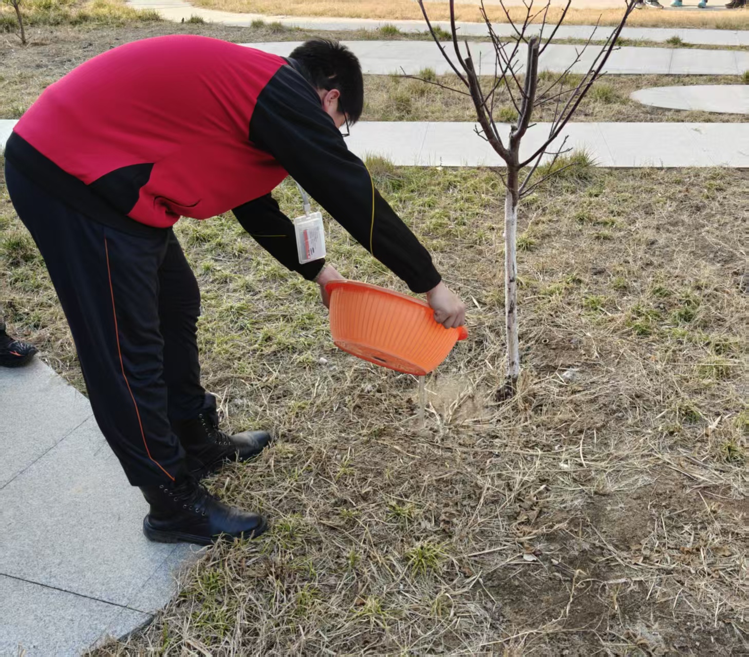 活动现场一派热火朝天,同学们互相配合、分工协作,提水、浇水、松土每一个动作都认真细致。有的小心翼翼将水洒向树苗根部,呵护嫩芽生长;有的往返于水源与树苗之间,即便额头沁出汗水也毫无怨言;还有的轻声叮嘱同伴均匀浇水,用细心与耐心守护每一抹新绿,充分展现了中职学子的活力与担当。