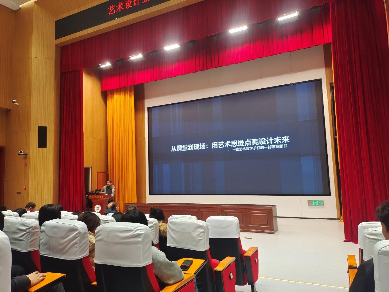 黄麟峰老师以 “美是什么” 为引,从哲学、生活与专业视角拆解美的本质,结合中外经典设计案例阐释 “美源于生活、融于实践、成于创造” 的核心观点,引导学生打破审美固有认知,在日常观察中汲取灵感、在专业学习中锤炼审美能力;同时,他分享环境艺术设计领域落地项目成果,通过图文拆解详解项目推进中的设计逻辑与问题解决思路,并结合市场动态分析室内设计、景观设计等热门就业方向前景,提出 “夯实专业基础、提升软件技能、积累实践经验、培养创新思维” 的成长建议,指导同学们明晰发展路径。