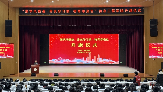 晨曦微露,红旗飘扬。2025年12月15日清晨,信息工程学院在新青年报告厅举行了一场庄严而富有教育意义的升旗仪式。本次仪式以“强学风根基,养良好习惯,铸青春底色”为主题,将爱国主义教育与学风建设、习惯养成深度融合,为全院师生上了一堂生动的“成长公开课”。学院领导、教职工及在校学生共同参与。