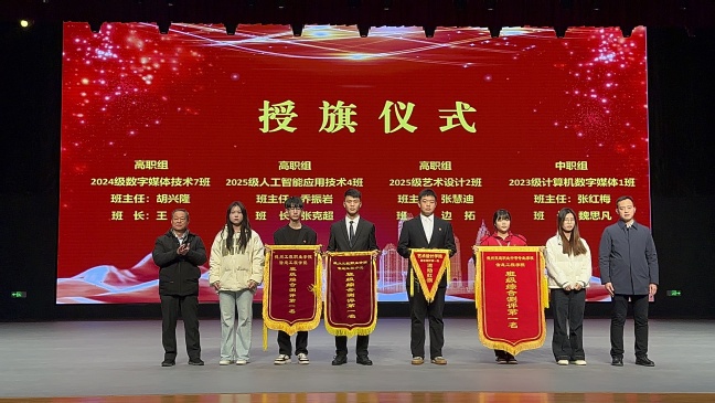 仪式设有表彰环节,旨在树立典型、激励先进。根据学院综合测评结果,艺术设计2班、人工智能5班、数字媒体技术7班、数字媒体1班因在学风建设与班级管理中的突出表现,获评“综合测评优秀班级”。学院院长刘永华、党总支副书记王伟强为获奖班级代表授旗,鼓励他们珍惜荣誉、再接再厉,发挥模范引领作用。