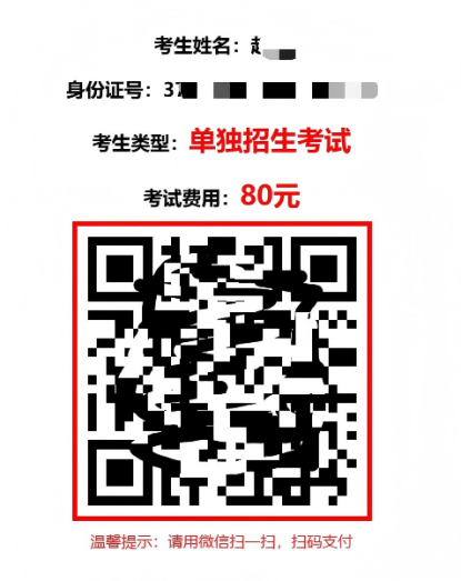 4.核实缴费金额(单招考生80元;综评和退役军人考生50元),确认无误后用微信“扫一扫”扫描显示的二维码进行缴费。