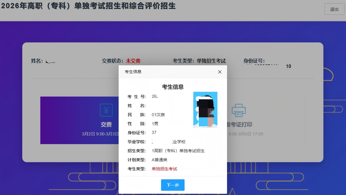 2.考生输入姓名、身份证号和验证码登录系统后,系统显示考生信息,请认真核实考生信息,确认无误后点击下一步。