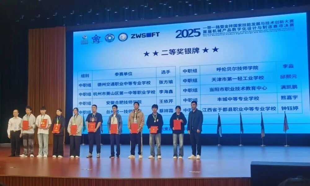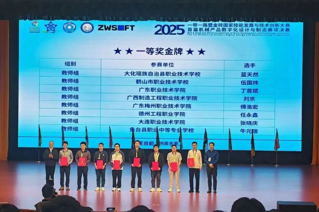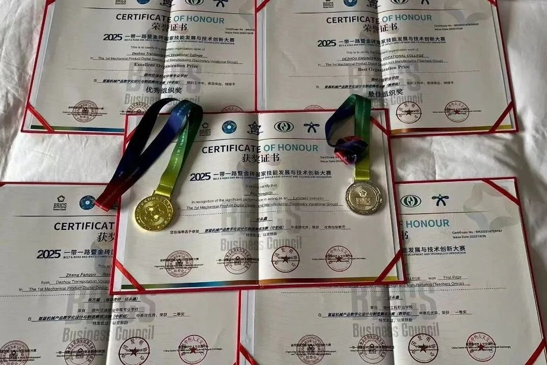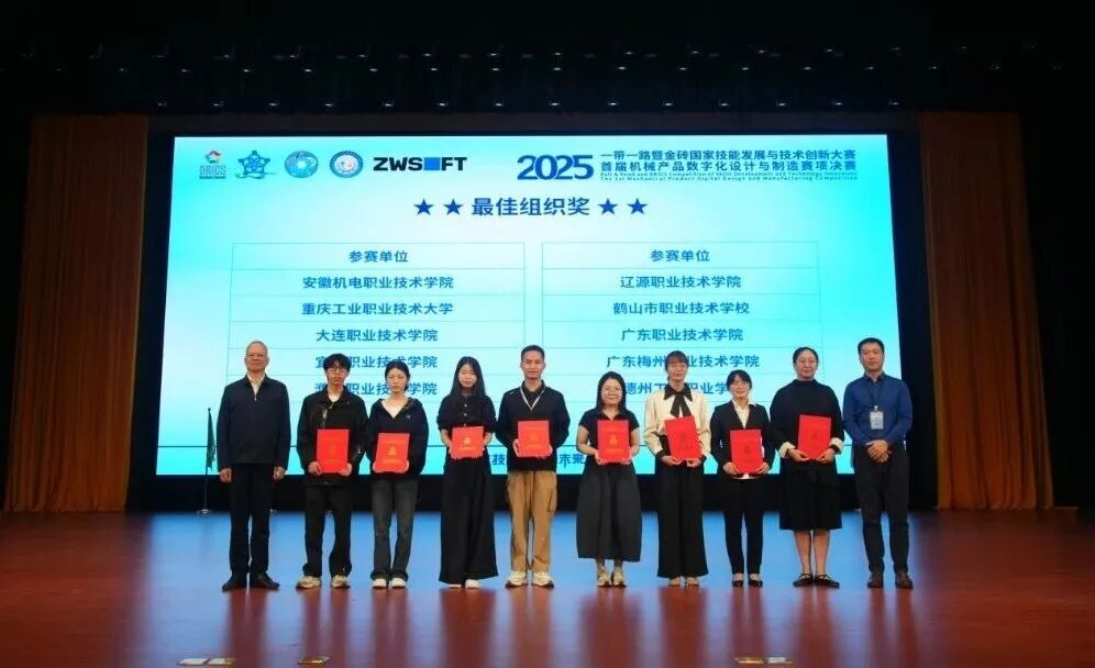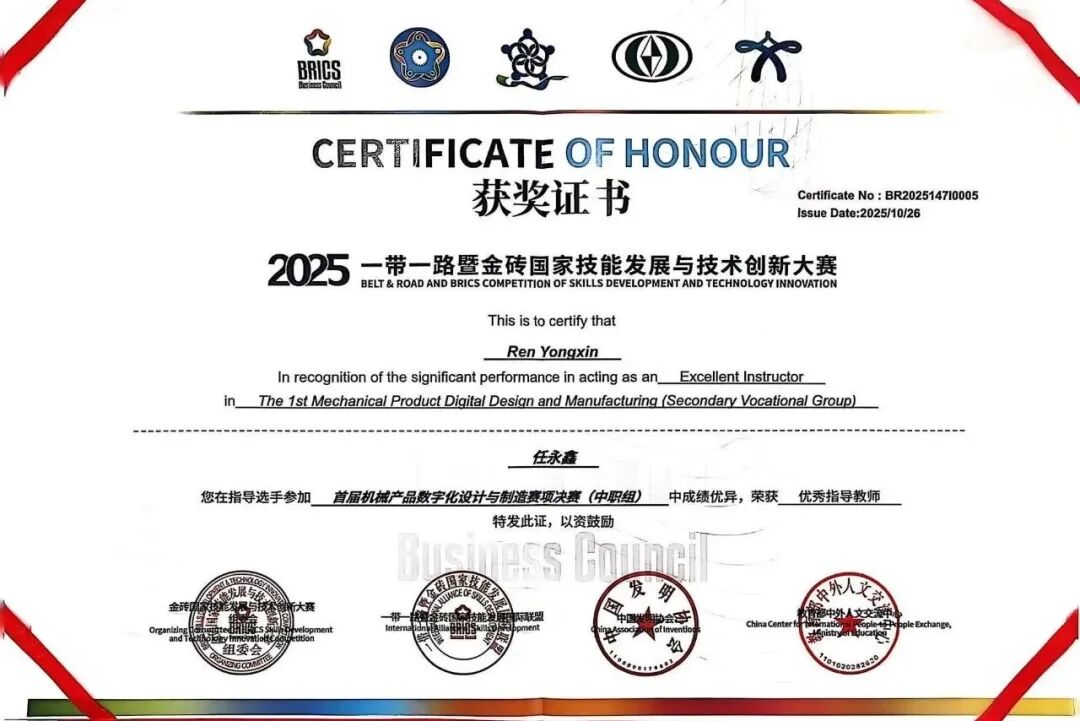 10月27日,2025“一带一路暨金砖国家技能发展与技术创新大赛”之首届机械产品数字化设计与制造赛项决赛在广西南宁圆满落幕。在这场代表职业技能领域顶尖水平的国家级A类国际赛事中,我校先进制造学院师生与来自国内外的优秀选手同台竞技,以卓越的表现斩获佳绩。其中,任永鑫老师凭借精湛技艺与深厚专业积淀,勇夺教师组一等奖(金奖),在其悉心指导下的张方瑜同学荣获中职组二等奖(银奖),同时,由于在组织工作中表现突出,我校高职组和中职组分别获得最佳组织奖和优秀组织奖。这一成绩充分彰显了我校在先进制造领域高水准师资建设与高质量人才培养方面的综合实力。