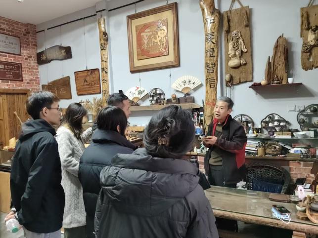 随后,师生一行前往董子文化街“木人堂”木刻刀笔书画工作室,拜访省级非物质文化遗产代表性传承人唐万武先生。工作室中竹木清香四溢,匾额、书签、木简等各类作品琳琅满目,尤其是7000多字的《孙子兵法》木简作品,以自然随形的材质与精雕细琢的工艺,让学生们叹为观止。他结合自身创作经历,分享了如何通过叠刻手法表现书画的浓淡干湿,以及在作品中融入地域文化元素的创作思路,鼓励学生既要传承传统技艺精髓,又要贴合现代生活需求进行创新。