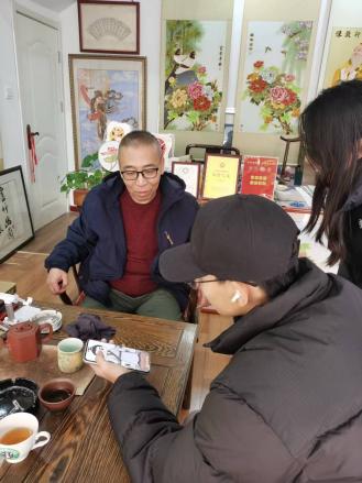 金丝彩贴作为省级非物质文化遗产,以“金为骨、彩为韵”为核心特色,凭借金丝勾勒轮廓、彩料填充肌理的独特技法,形成了色泽艳丽、层次分明、立体感强的艺术风格,广泛应用于装饰画、摆件、服饰配饰等领域,兼具艺术价值与实用价值。工作室负责人、金丝彩贴非遗传承人李爱民老师热情接待了师生一行,并结合自身从业经历,系统讲解了金丝彩贴的历史渊源、文化内涵及技艺传承脉络。
