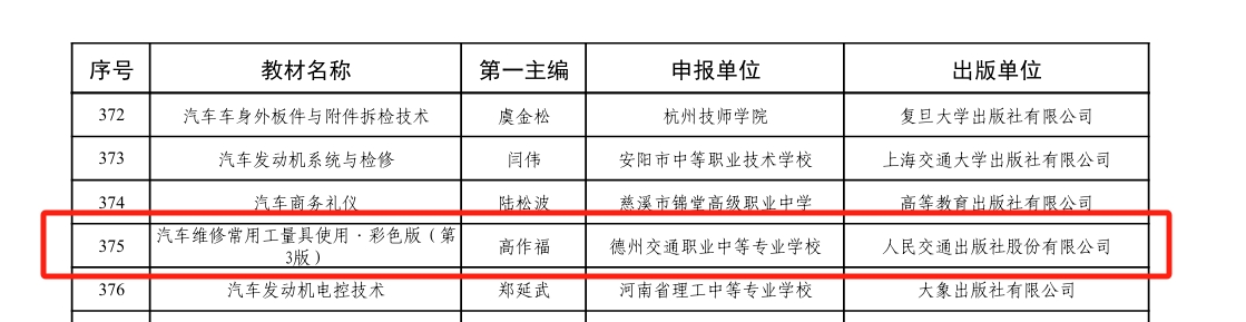 近日,德州工程职业学院高作福老师编写的教材《汽车维修常用工量具使用》,成功入选第二批“十四五”职业教育国家规划教材遴选公示名单。这是继学校《汽车底盘常见维修项目实训教材(第2版)》《汽车发动机常见维修项目实训教材(第2版)》两本教材入选首批“十四五”职业教育国家规划教材后,我院在教材建设领域取得的又一重要成果,彰显了学校在汽车类专业教学资源建设中的持续实力与行业认可度。