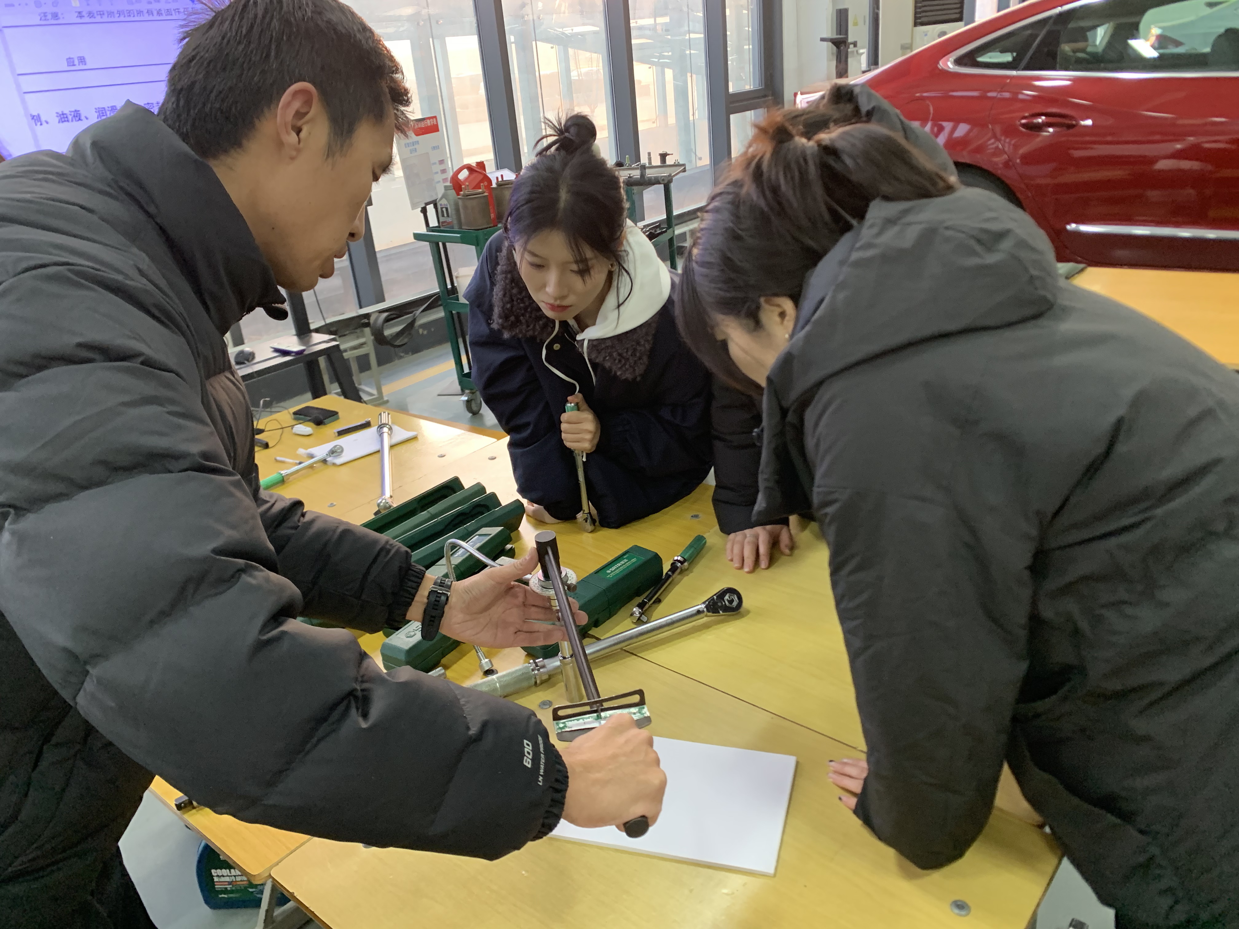 培训紧扣产业前沿与教学实际,设置两大核心模块:模块一:新能源车辆高压安全与整车维护——由孙波、李卜两位资深讲师联合授课,重点强化高压系统操作规范、绝缘检测、动力电池状态评估及日常维护流程;模块二:新能源动力总成拆装与部件检测——由张利军、孙波领衔指导,覆盖电驱动总成认知、变速器箱体与电机动力总成的规范拆装、关键尺寸测量及故障识别。