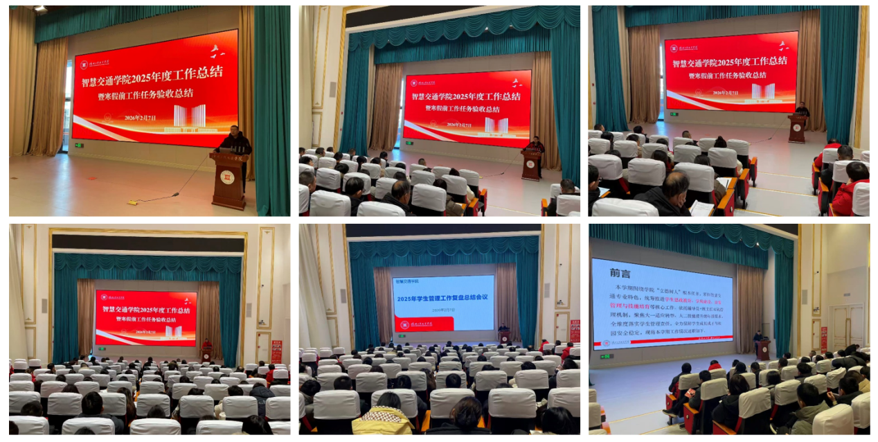 此次会议既是对 2025 年度全院工作的全面总结与验收,更是对新学期工作的系统谋划与动员部署。智慧交通学院全体教职工将以此次会议为契机,凝心聚力、真抓实干,扎实做好年度收尾和假期各项重点工作,以更加昂扬的斗志、更加务实的作风,对标五大核心工作目标攻坚奋进,持续推进学院专业建设、人才培养等各项工作提质升级,不断推动智慧交通学院高质量发展再上新台阶,为学校事业发展贡献更多力量。